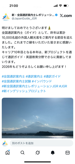 通訳ガイドは個人事業主として現場に立つことが多く、会計的にも元旦が1年の始まりとなります。12月末で一区切りをつけ、毎年すっきりと新しいスタートが切れるのも、この仕事ならではの魅力。私自身、昨年は累計10,000名を超える海外ゲストをご案内する節目を迎えました。キャリア10年目となる今年は、新たなプロジェクトを通じて、通訳ガイド・英語教育分野で、より一層の貢献を目指しています。(2026/01/01 投稿)